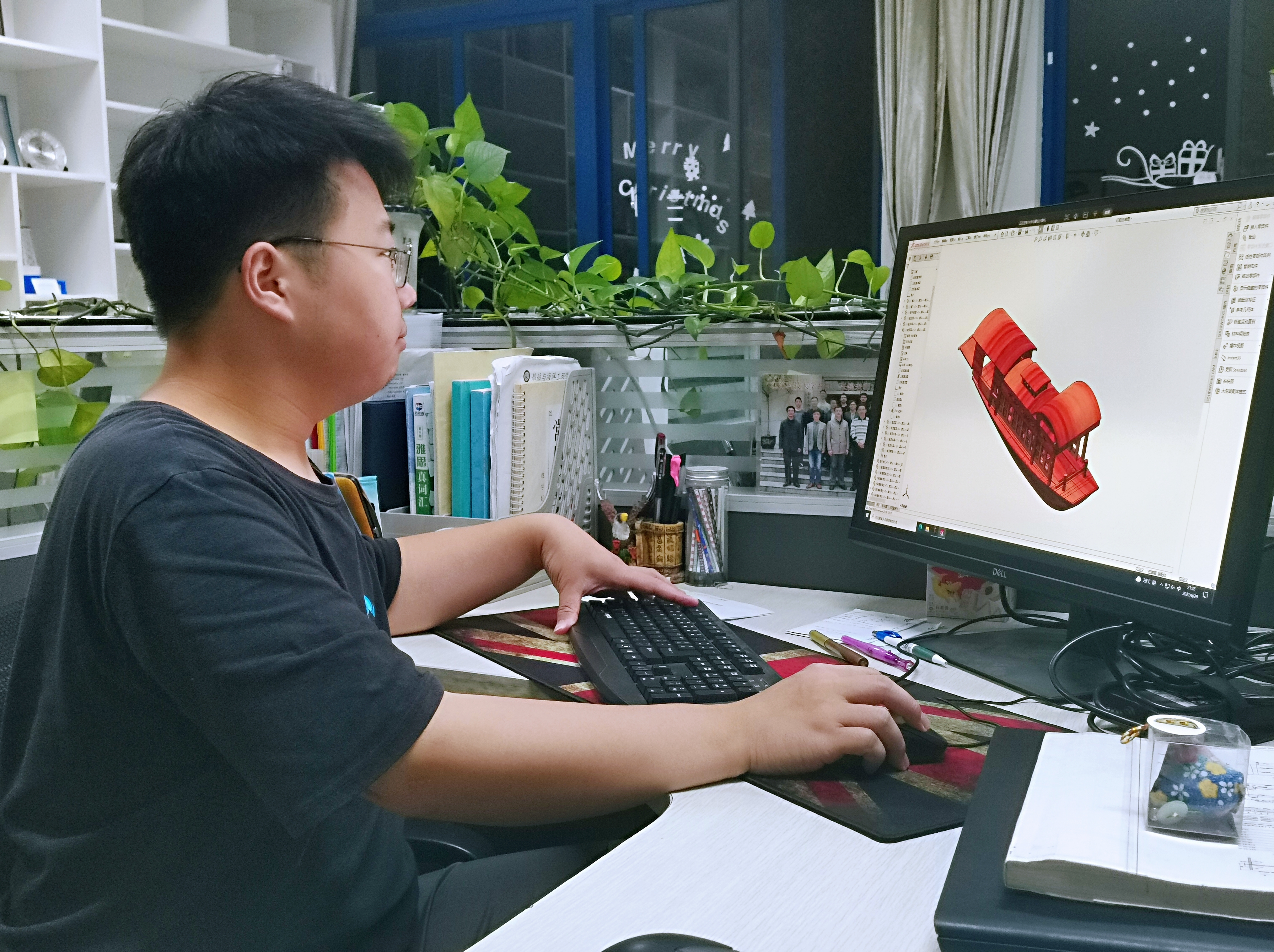 在图纸设计工作完成后,便是红船实物模型的制作。要做好一艘红船模型,要在功能性、原材料、制作工艺等方面有所讲究,尽可能按照真正的红船制作流程来制作,这样才能够在形制相似的基础上兼具“精气神”。为了做到这一点,船海专业的王文庆和施琦等人在细节方面下足了功夫,无论在板材的选择以及后续的切割、打磨、雕刻、组装过程,都凭借着精益求精的工匠精神,尽心雕琢着这件艺术品。