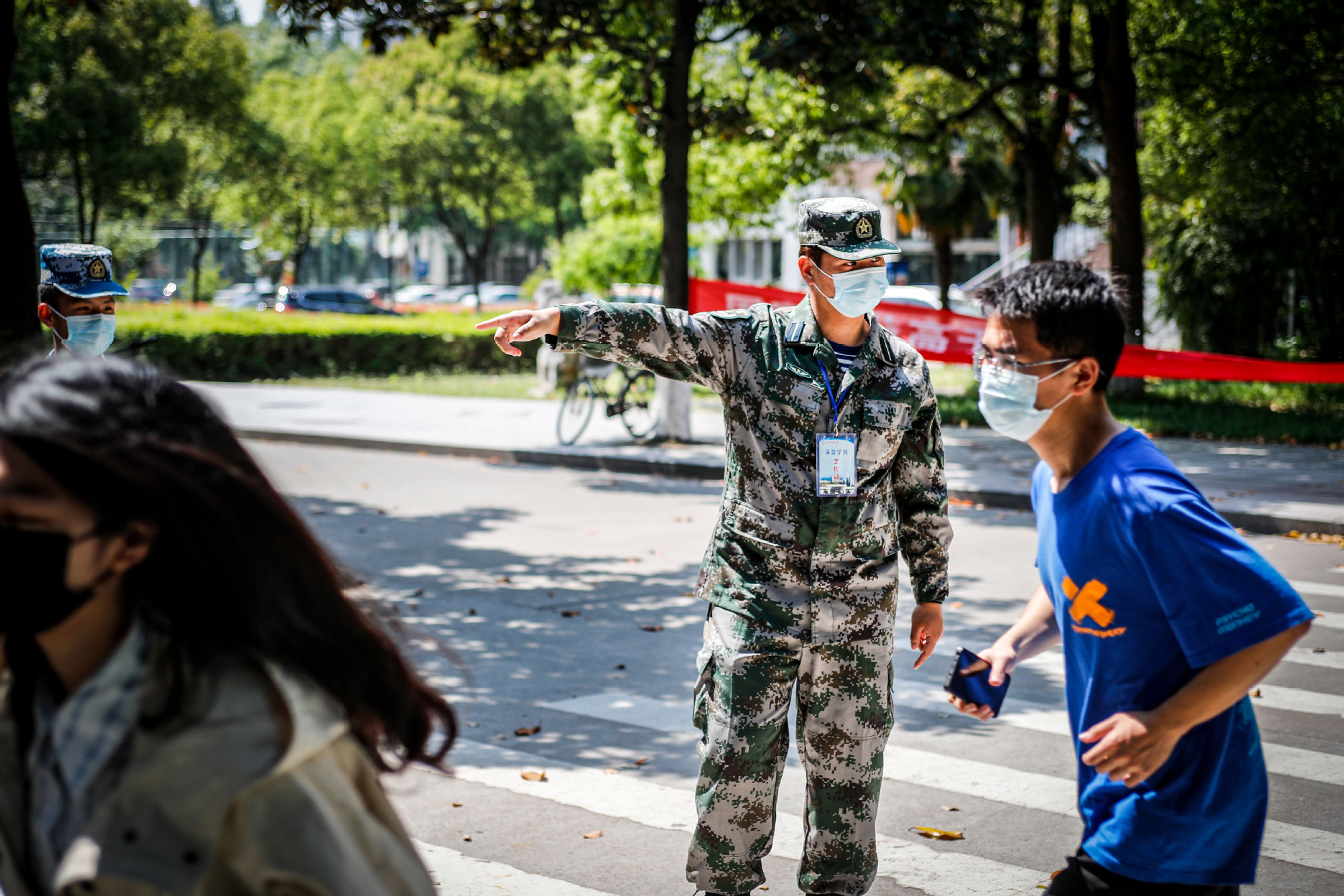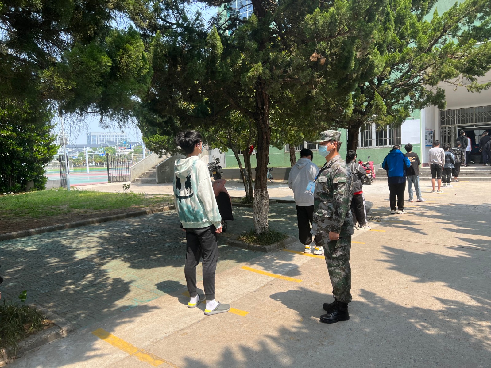 4月13日那天下起了倾盆大雨,学校常规核酸监测照常进行。梅玟煜在队伍间来回走动维持秩序,雨水和车辆溅出的水花把衣服鞋子都打湿了。队伍虽然只有两百多米长,梅玟煜当天却走了两万多步。雨天执勤让他回想起在某部警卫连执行野外任务,“虽然艰苦异常,但内心的责任感会让我坚守到最后一刻。” 当天雨中执勤的还有董昶,在某部远程火箭炮营服役时,曾多次赴酒泉和各岛屿参加重大作战演习任务。“衣服全都湿了也没办法,我们是一定要先把任务完成再回去的。” 董昶说两人回去后,第一时间在群里报告雨天执勤情况,提醒雨天要提前设置一些路障,让车辆有序流动;一定要用比较和善的语气,尽量让大家理解工作目的等。