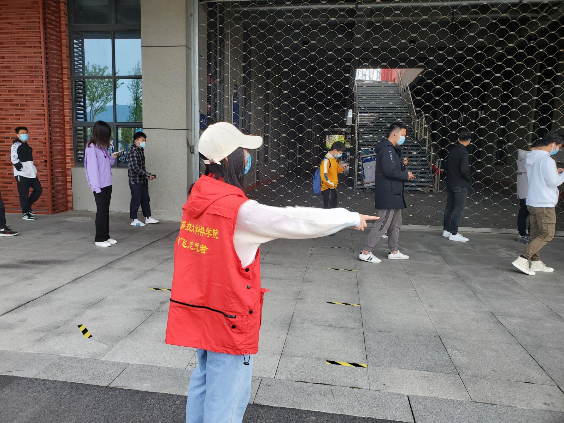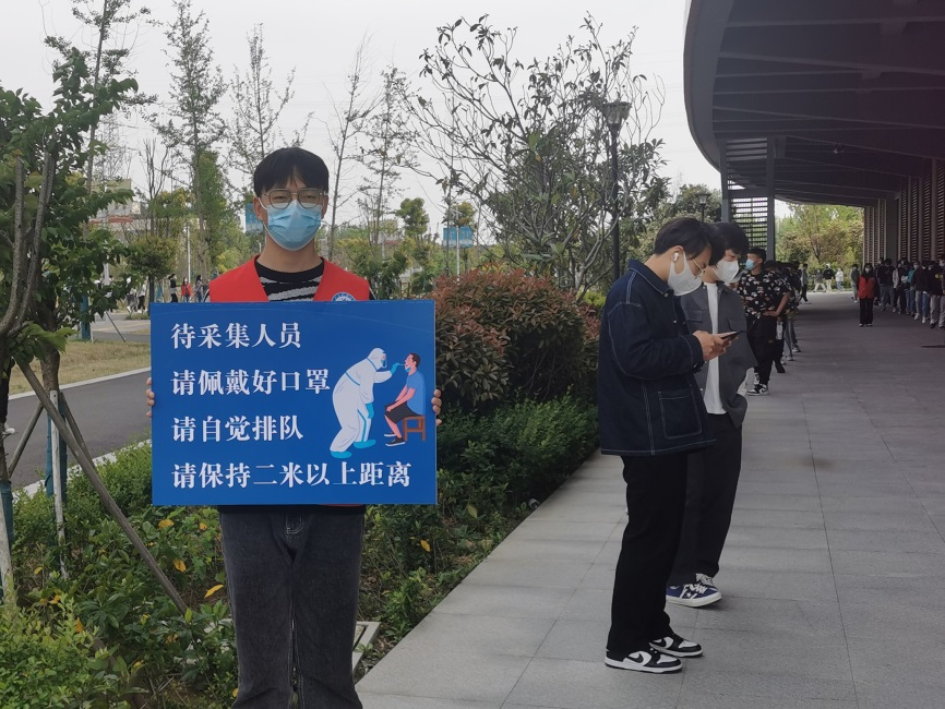 当天从深夜至黎明,首批招募的百余名志愿者响应号召,站在了学校疫情防控第一线。“从每个学院招募10人左右,主要是负责全员核酸检测的秩序维护,还有引导两个食堂就餐人群合理分流、提醒排队师生戴好口罩并保持间隔距离、鼓励同学错峰就餐等。”校团委佘顾雨老师介绍,通过线上培训、精准对接等方式,招募的志愿者分批次、有组织的参与疫情防控工作,并配备小喇叭、红马甲、标语牌等。