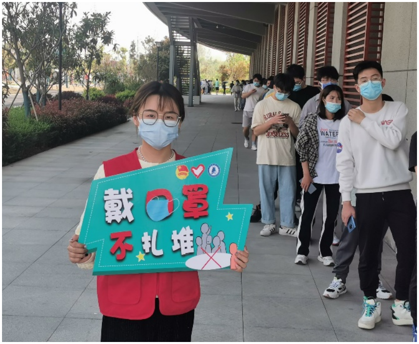 “请大家保持两米间隔,有序排队。”“请没带身份证的同学提前扫下二维码。”在自己不用做核酸检测的时间,高荣珍同学都会主动穿上红马甲,在核酸点维持秩序,帮助没有带身份证的同学在手机上预约核酸检测。