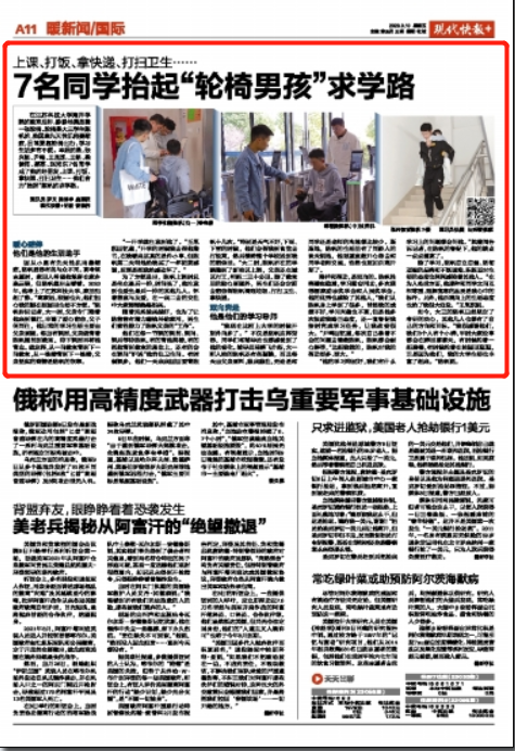 在乐玩手机版海洋学院的教室后排,静静地摆放着一张轮椅。轮椅是大三学生陈帆的,他因患先天性肌肉萎缩症,日常要靠轮椅出行,学习生活多有不便。幸运的是,张兴韧、尹鸣、王胤凯、王铭、梁健闯、郭磊、赵湘东7名同学成了他的好朋友,上课、打饭、拿快递、打扫卫生……他们合力“抬起”陈帆的求学路。