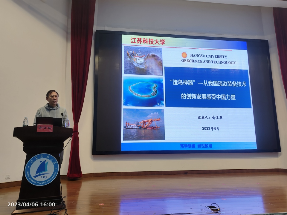 俞孟蕻教授在讲课中对我国的疏浚事业从最初的遭受国外封锁和垄断,核心技术受制于人,只能“买洋船搞疏浚”,到上世纪90年代,中国开始自主建造500方-1500方挖泥船,到2002年,中国大型挖泥船进入快速发展期,开启了大型挖泥船数字化信息化时代,再到现在,拥有世界最大的疏浚船队,耙吸船总舱容量和绞吸船总装机功率均排名世界第一这一从“引进”到“借鉴”再到“自主创新”的发展史给同学们作了详细介绍。通过对我国疏浚行业信息化、智能化的发展介绍,俞教授又从宏观层面详解了挖泥船的控制系统这一技术核心,通过实际应用中的动画和丰富的图文资料向大家展示了“造岛神器”神在哪里,带领大家领略了高科技的惊人力量。俞教授通过引用习近平总书记多次对海洋事业和海洋强国的重要论述指出,中国疏浚事业的发展和不断壮大,是一代代科研工作者埋头苦干、反复攻关、不断创新的真实写照,是中国几代船海人艰苦奋斗、努力拼搏谱写出的辉煌篇章。以俞教授为代表的江乐玩手机版人在其中做出了努力、贡献了智慧,体现出江乐玩手机版人在船舶海工领域“吃得了苦、扎得下根、聚得齐心、干得成事”的特质。