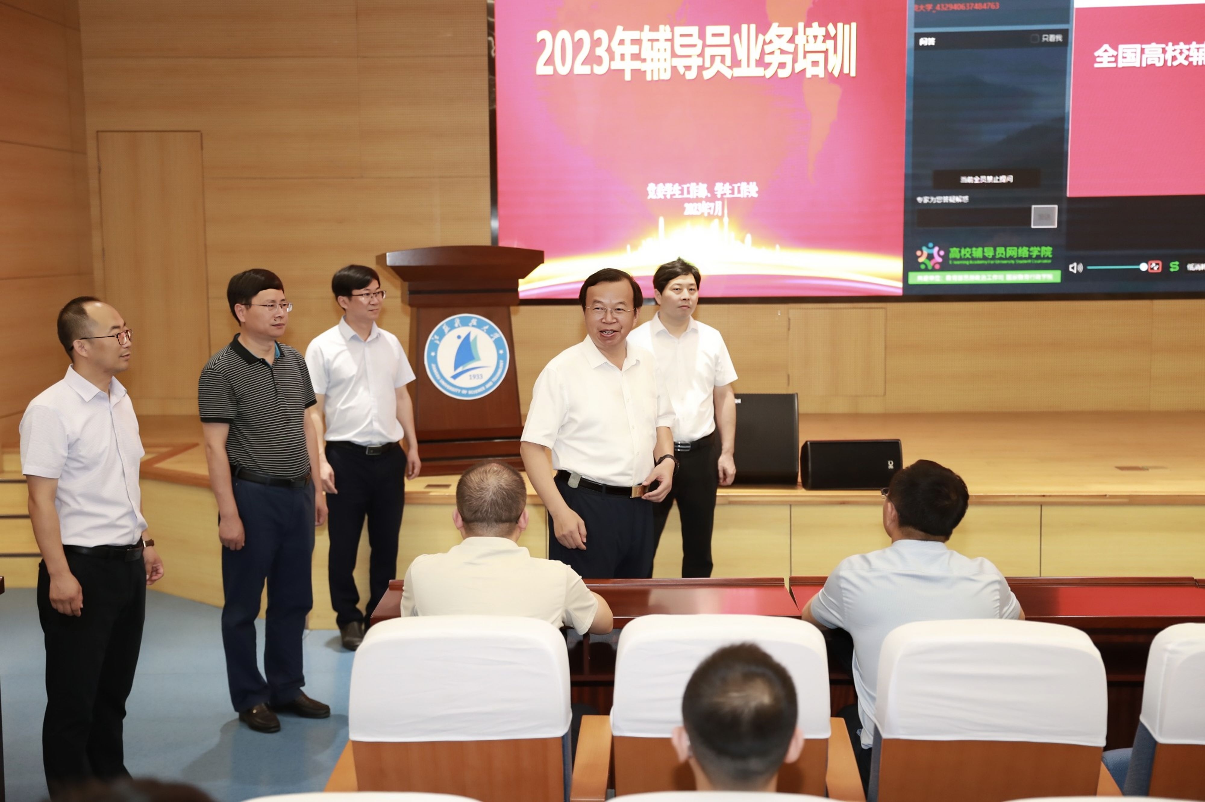 听闻全校辅导员正在学校参加教育部组织的线上培训,周南平校长一行特地来到图书馆105室看望正在参加培训的辅导员,他讲述了自己的第一份工作就是辅导员工作,他希望参训辅导员不要有思想压力,要把精力集中在提升自我、提高工作成效上,通过培训,学到的工作方法多一些,化解矛盾的能力强一些,一定要在培训中有所收获。