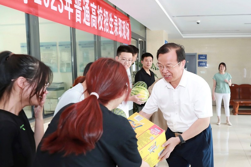 阳光炽烈,夏意正浓。7月18日下午,校长周南平看望慰问坚守一线的师生。师生员工们或忙于招生录取,或守护学校安全,或为办学90周年校庆演出排练,或为留校师生提供美味饮食,或积极备赛,或做实验做科研,周南平校长代表学校感谢大家的辛勤付出,希望大家挥洒的每一滴汗水都能换来丰收的喜悦,为学校高质量发展作贡献。校党委常委、副校长潘锦全、胡爱祥陪同看望慰问坚守一线的师生。