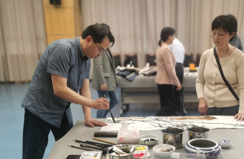 古韵绵长的音律流动中,书画家们满怀对艺术的热爱和激情,以现场创作的方式展现中国传统书画艺术的魅力。他们泼墨敷彩,各展所长,或笔走龙蛇,或落纸云烟,神畅气贯各得其法,挥洒意气激情奔放,将对艺术的深刻理解和对学校的诚挚祝福欣然倾注笔端。经过数小时的现场创作,书画家们为学校90周年创作了近百幅书法、绘画作品。这些作品承古创新,形殊趣异,各美其美,相映成趣,用书画立言,以笔墨承意,对学校的办学理念和特色进行了生动鲜活的演绎和诠释,展现了精湛的艺术修为和造诣,充分体现了中国书画艺术的用笔韵味和意境之美。以笔会友、集中创作的浓厚氛围还进一步激发了书画艺术家们的创作热情,他们凝神挥毫,渐入佳境,一度进入了心无旁骛浑然忘我的艺术创作境界,佳作纷呈,蔚为大观。大家在艺术的探讨和品鉴中相谈甚欢,流连忘返,才思与灵感在这里碰撞,气韵与风雅在这里交融,现场气氛欢快而热烈。
