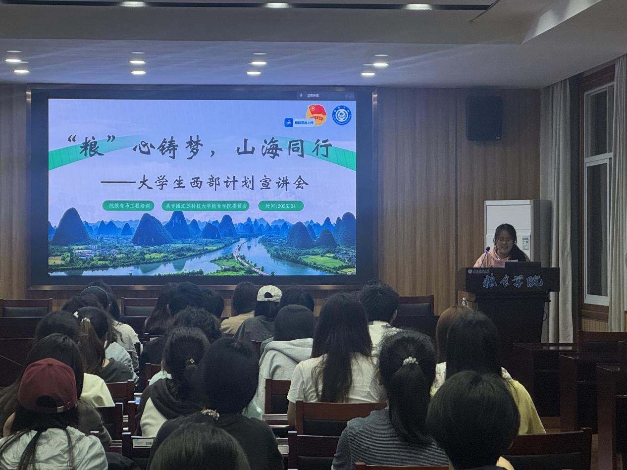 4月21日,粮食学院在学院510会议室开展“‘粮’心铸梦,山海同行”大学生西部计划宣讲会,通过经验分享、故事讲述与政策解读等形式,引导青年学子深入了解西部计划与乡村振兴志愿服务项目。机械学院辅导员、西部计划专项志愿者李福来,2024届粮食学院毕业生、现乡村振兴计划志愿者刘星,粮食学院团委书记武兆文以及粮食学院青马工程学员参加本次会议。