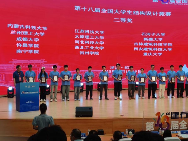 10月15日至19日,第18届“建行杯”全国大学生结构设计总决赛在绍兴文理学院举行。学校土木工程与建筑学院孙雯峻、魏顺林、魏文杰同学组成的“江科海韵”代表队与清华大学、同济大学、东南大学等来自全国119所高校的120支参赛队同台竞技,斩获第18届全国大学生结构设计竞赛二等奖(全国第49名)的好成绩,这是我校继2024年第17届全国大学生结构设计竞赛后获得的又一好成绩。学校获全国大学生结构设计竞赛“优秀组织奖”。
