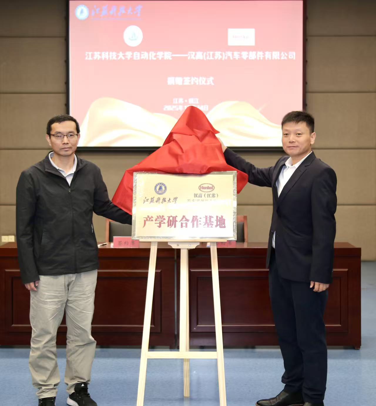 仪式核心环节,王荣代表学校向汉高集团颁发捐赠证书。随后,校企双方共同签署奖学金捐赠协议,明确奖学金发放标准、评选流程及学生培养等方面的合作细节。紧接着,双方为“校企产学研合作基地”揭牌,这一举措标志着双方在产学研融合领域的合作正式迈出实质性步伐。