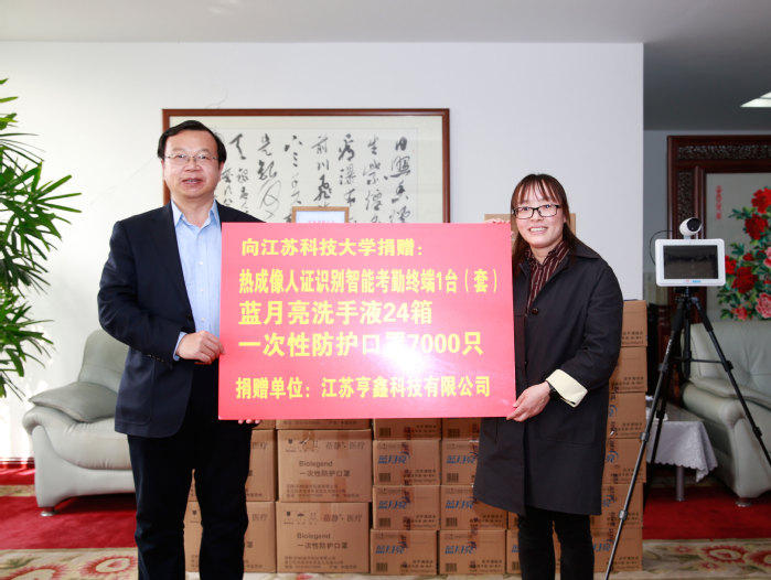 4月17日下午,江苏亨鑫科技有限公司向学校捐赠一批疫情防控物资助力开学,这批捐赠物资包含热成像人证识别智能考勤终端1台、蓝月亮洗手液24箱、一次性防护口罩7000只。宜兴市人社局市场办处长陈霁,江苏亨鑫科技有限公司人力资源部长温慧敏等一行三人专程来校捐赠疫情防控物资。校长周南平、副校长汤建出席捐赠仪式,学生处、团委、继续教育学院、教育发展基金会等相关职能部门负责人参加捐赠仪式。仪式由对外合作处处长佘建国主持。