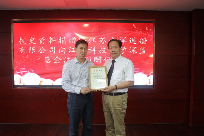 5月18日,校史资料捐赠暨江苏金洋造船有限公司向乐玩手机版深蓝基金注资捐赠仪式在镇江市交通运输综合行政执法支队会议室举行,校党委书记葛世伦,副校长汤建,党委常委、宣传部长周春燕,镇江市交通运输综合行政执法支队支队长、校友、“深蓝教授”赵永富,镇江海事局政委、校友、“深蓝教授”彭慧敏,华泰证券湖北分公司总经理、校友、“深蓝教授”袁红彬,江苏金洋造船有限公司董事长兼总经理、校友练文林等出席捐赠仪式。捐赠仪式由学校对外合作处处长佘建国主持。