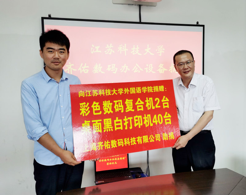 6月16日上午,学校与上海齐佑数码科技有限公司捐赠办公印刷设备签约仪式在外国语学院会议室举行,这批设备包括彩色数码复印机2台、桌面黑白打印机40台,总价值17万元。副校长汤建,上海齐佑数码科技有限公司总经理、2011届校友常凯出席捐赠仪式,外国语学院领导班子、学校教育发展基金会、对外合作处以及部分师生代表参加捐赠仪式。仪式由对外合作处处长佘建国主持。