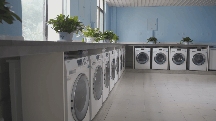 “如果衣服脏了,不想动手洗怎么办?”学校还为同学们专门开辟了自助洗衣房,崭新的滚筒洗衣机将为同学们提供自助洗衣服务。另外,每一个学生组团,都有一个便民服务点,提供必要的生活用品、食品等,包括饭盒等都可以在便民服务点买到。