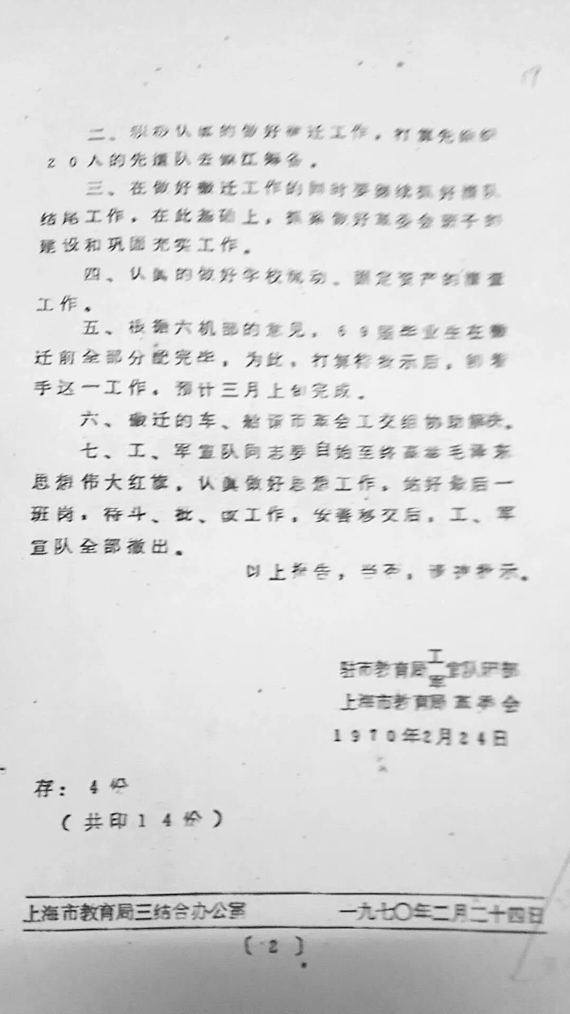 五十年前的上海船舶工业学校和处在文化大革命中的全国所有学校一样:在驻校工宣队、军宣队主持下,实行革命大联合,成立革委会,为学校复课做准备,这是合民意、顺民心的好事,广大教职工都十分高兴。就在这时,1970年初,刚结合进校革委会任主任的老干部、老领导从北京开会回来,带来了一个令全校教职工十分震惊的消息:中国人民解放军第六机械工业部军事管委会在征得上海市革委会、江苏省革委会同意后,决定上海船舶工业学校搬迁江苏镇江继续办学。这一突如其来的消息,在广大教职工中引起了强烈反响和不安,大家的这种情绪是完全可以理解的。