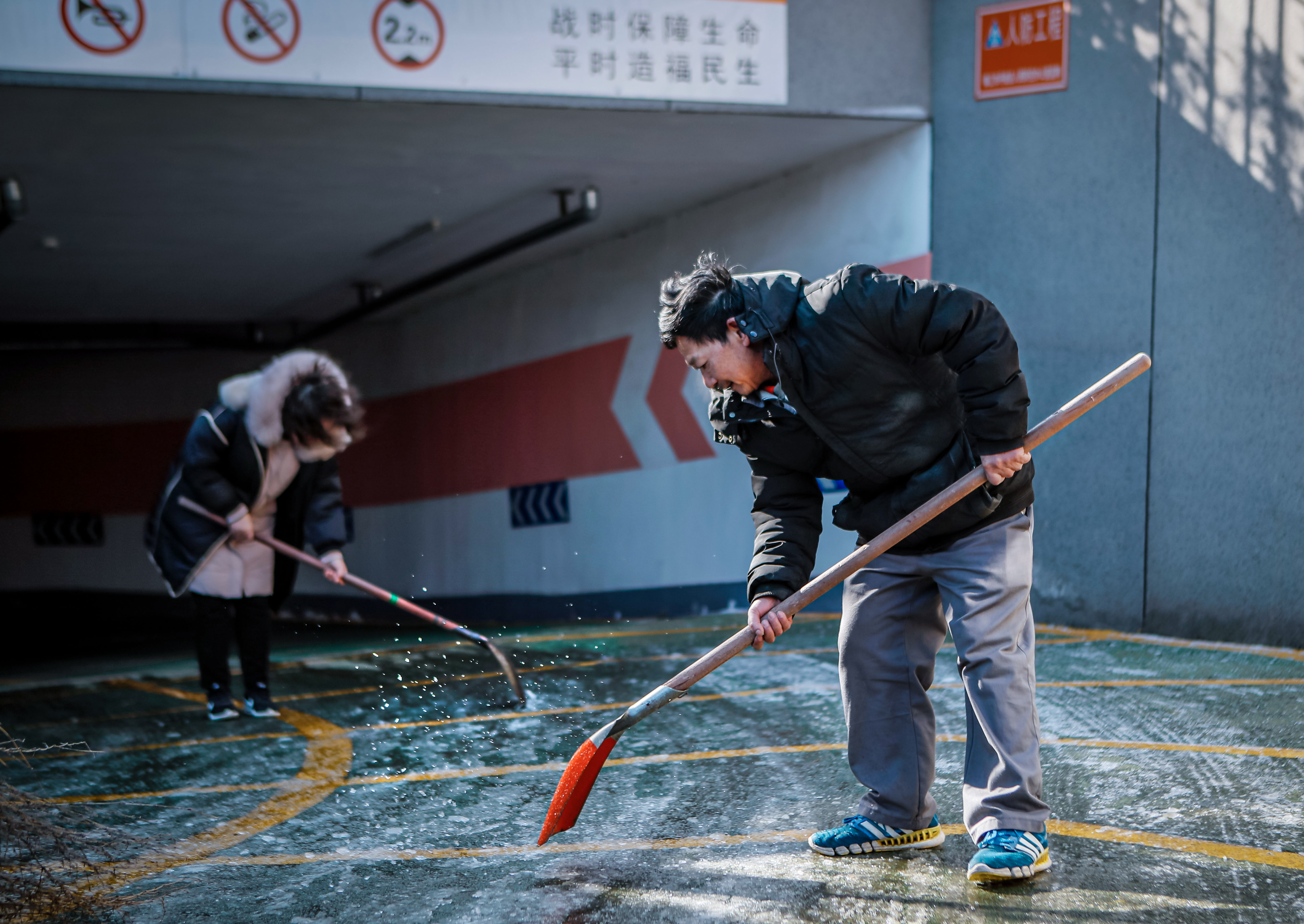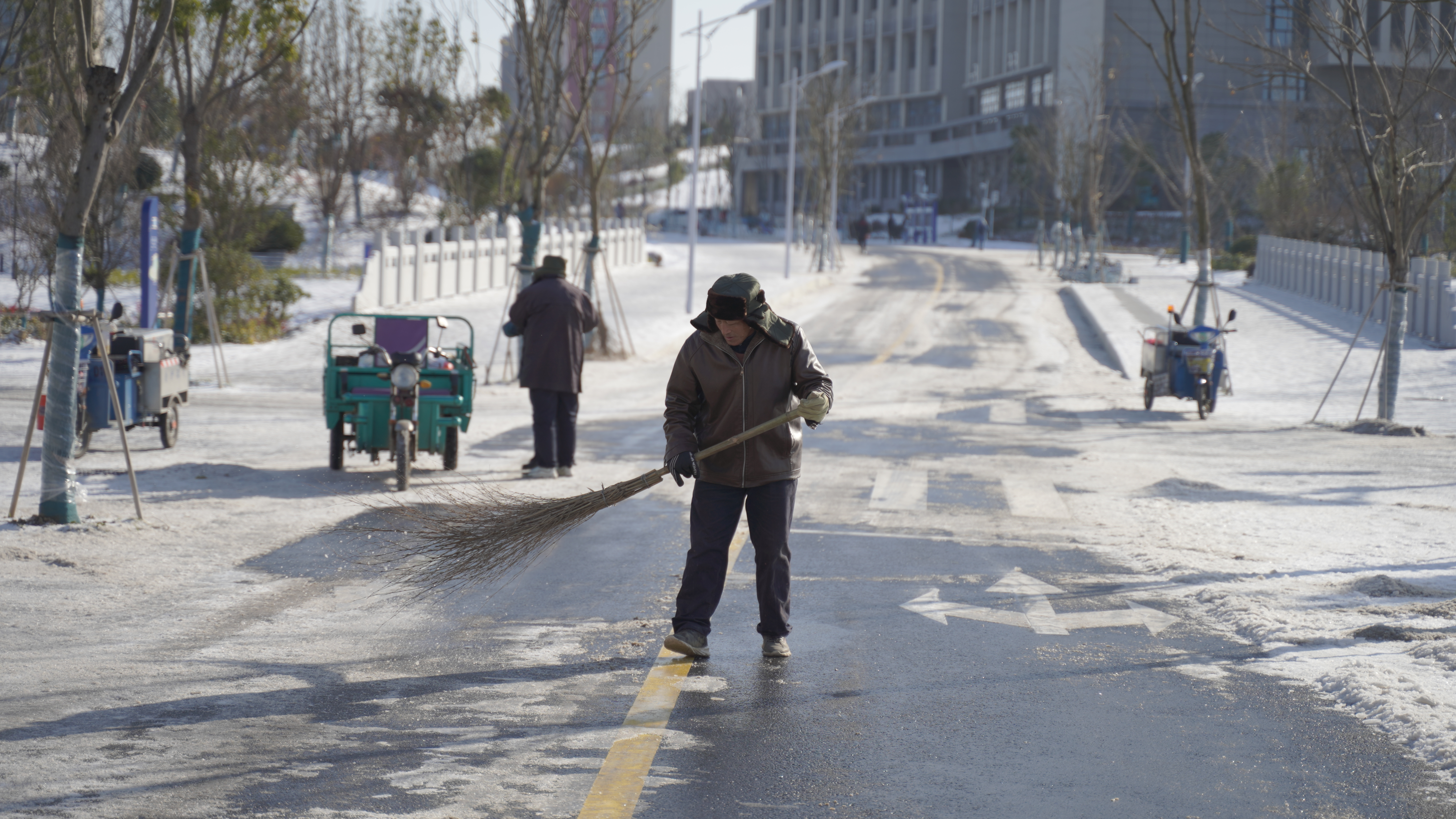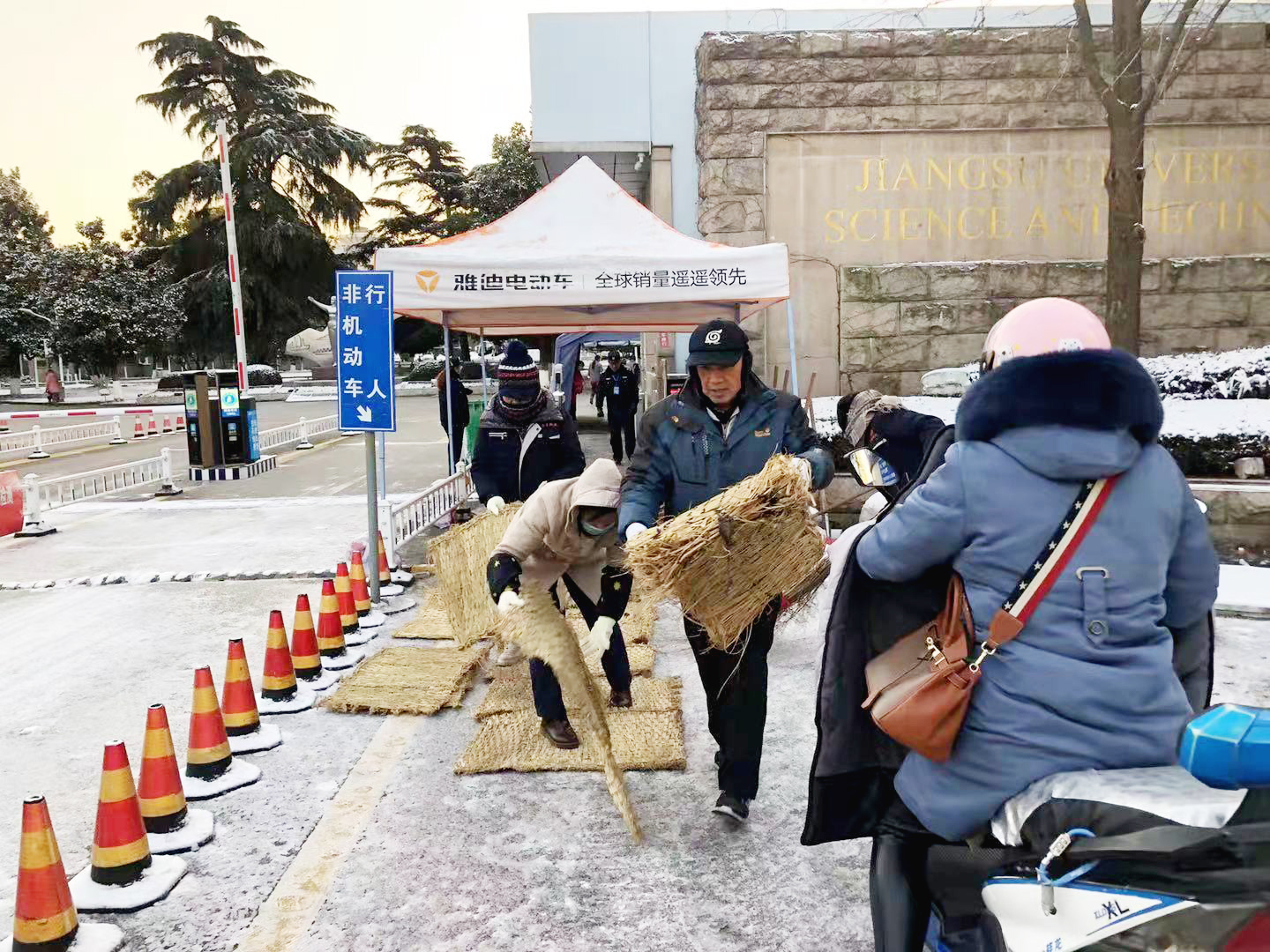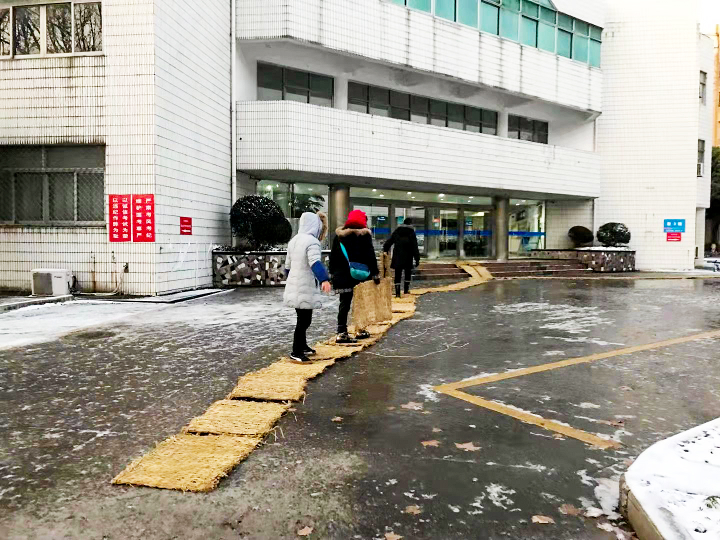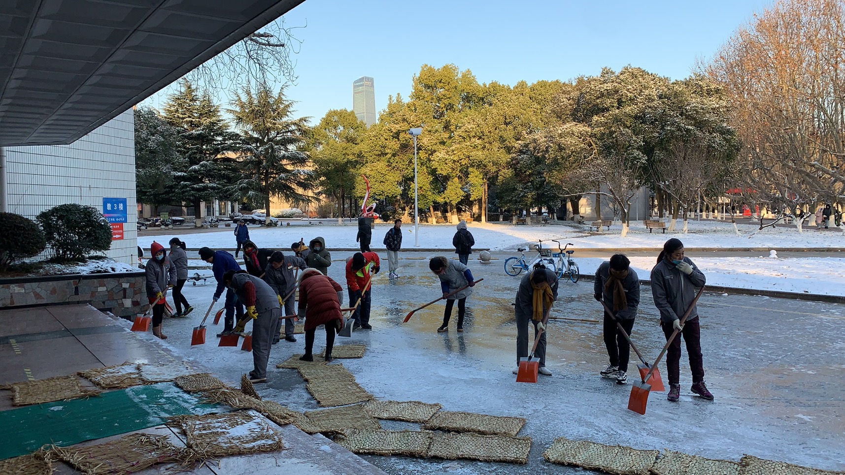 面对29日洋洋洒洒丝毫没有停歇的大雪,后勤集团负责人判断次日学校必然有艰巨的“除雪”任务。当晚八点,后勤物业部门的同志顶着寒风,冒着大雪在校园主干道上撒布融雪盐,减少道路冰冻。为了让员工避免次日上班路上奔波,后勤集团在校内安排了夜晚休息场所。物业中心罗菊兰的家中有老人,不得不在晚上回去照顾,第二天再赶到学校:“天气非常寒冷,路面都冻起来了,为了不被路况耽搁,凌晨四点钟就从家里慢慢地骑电瓶车赶往学校。”