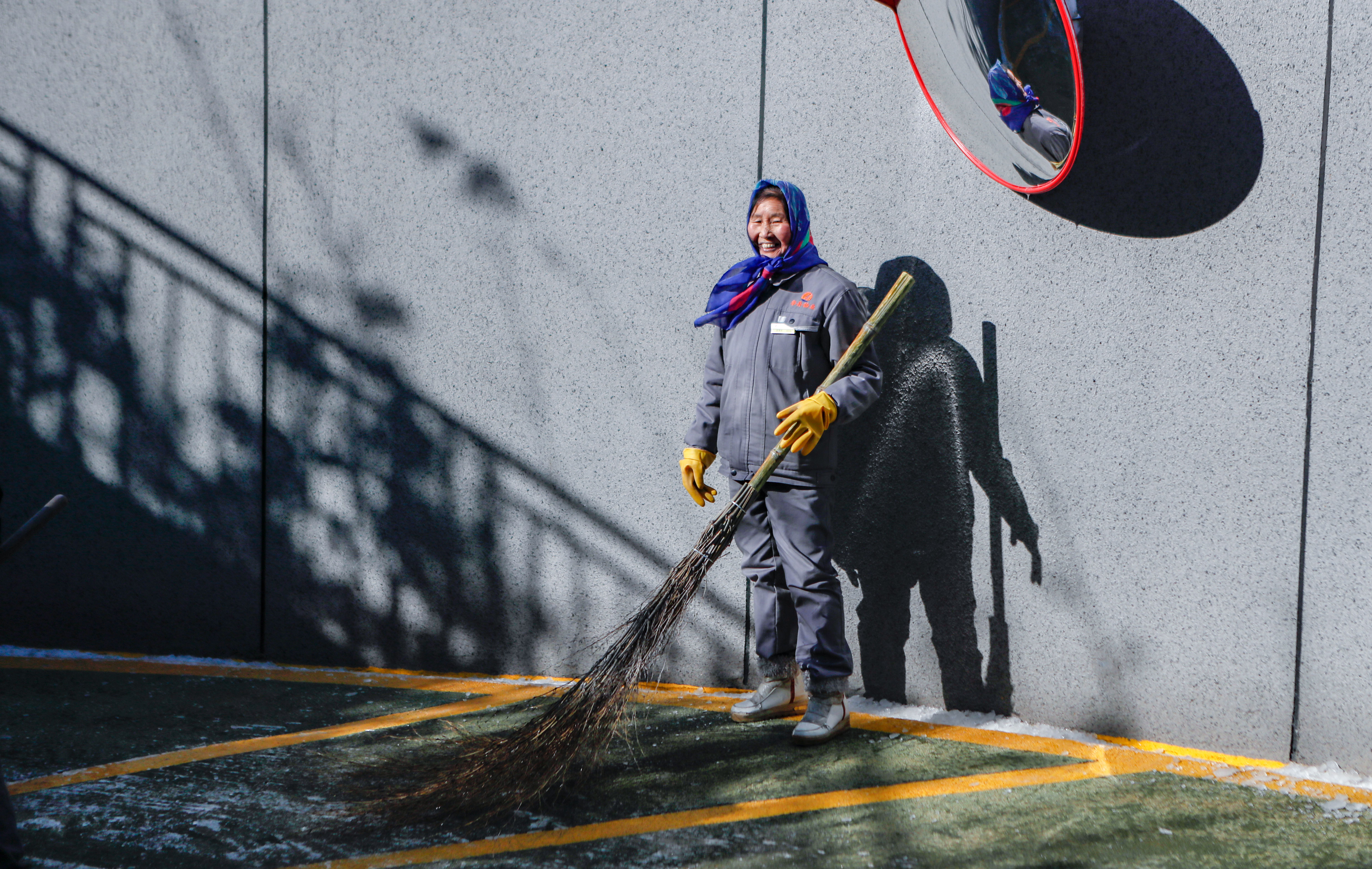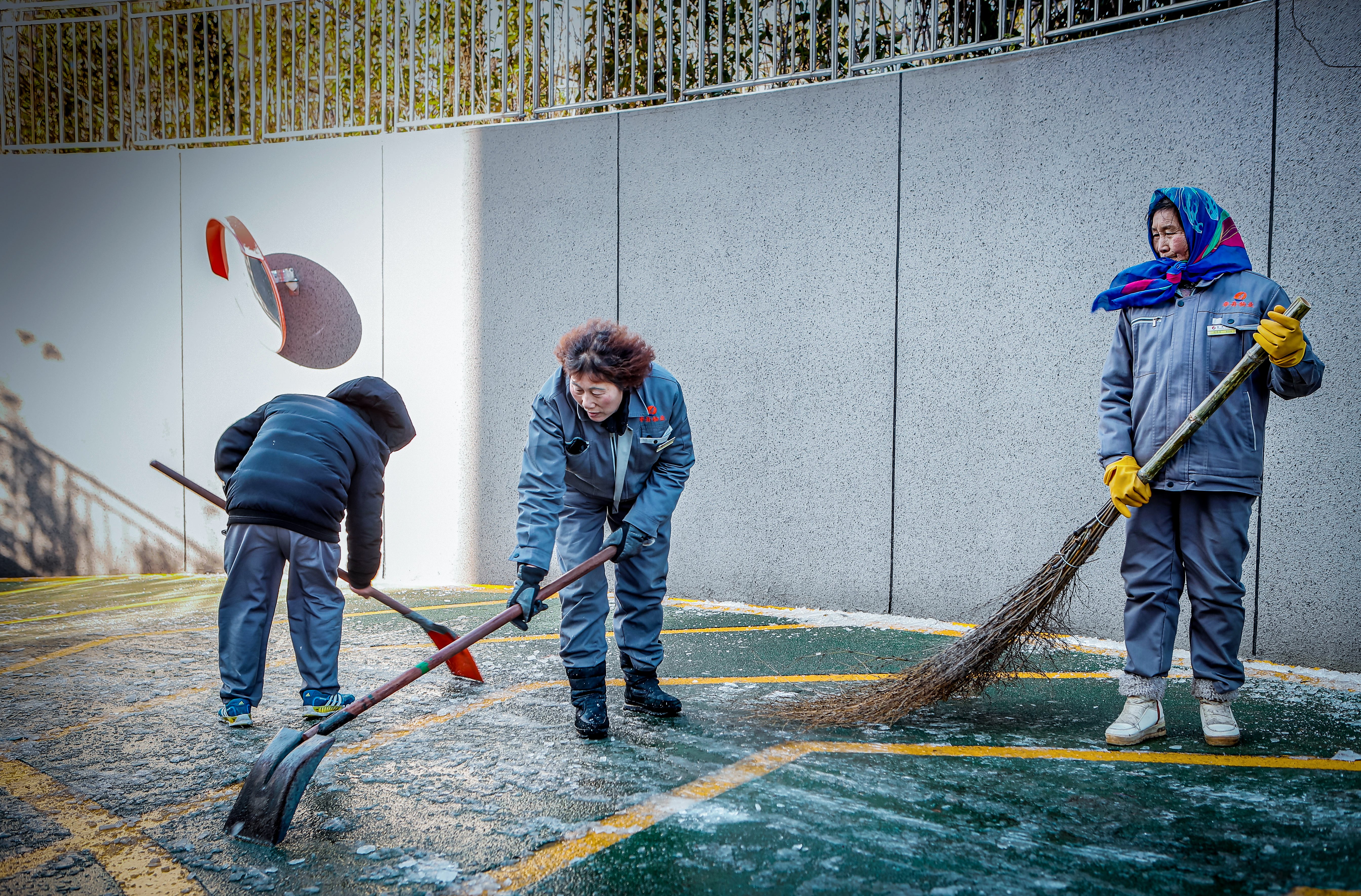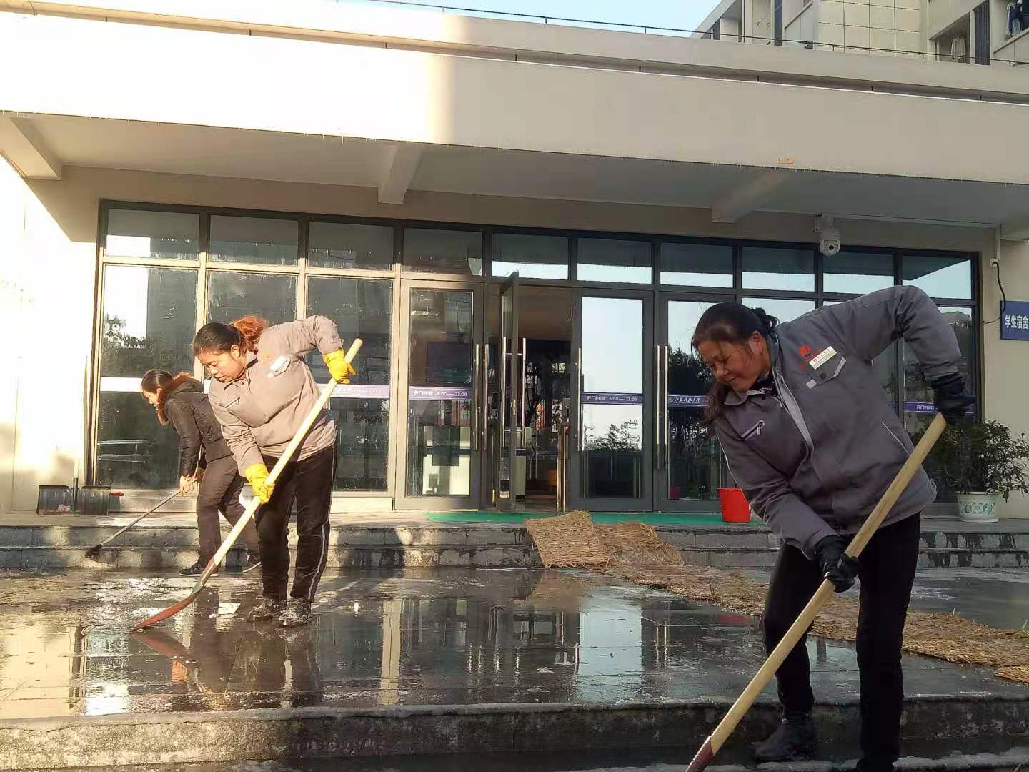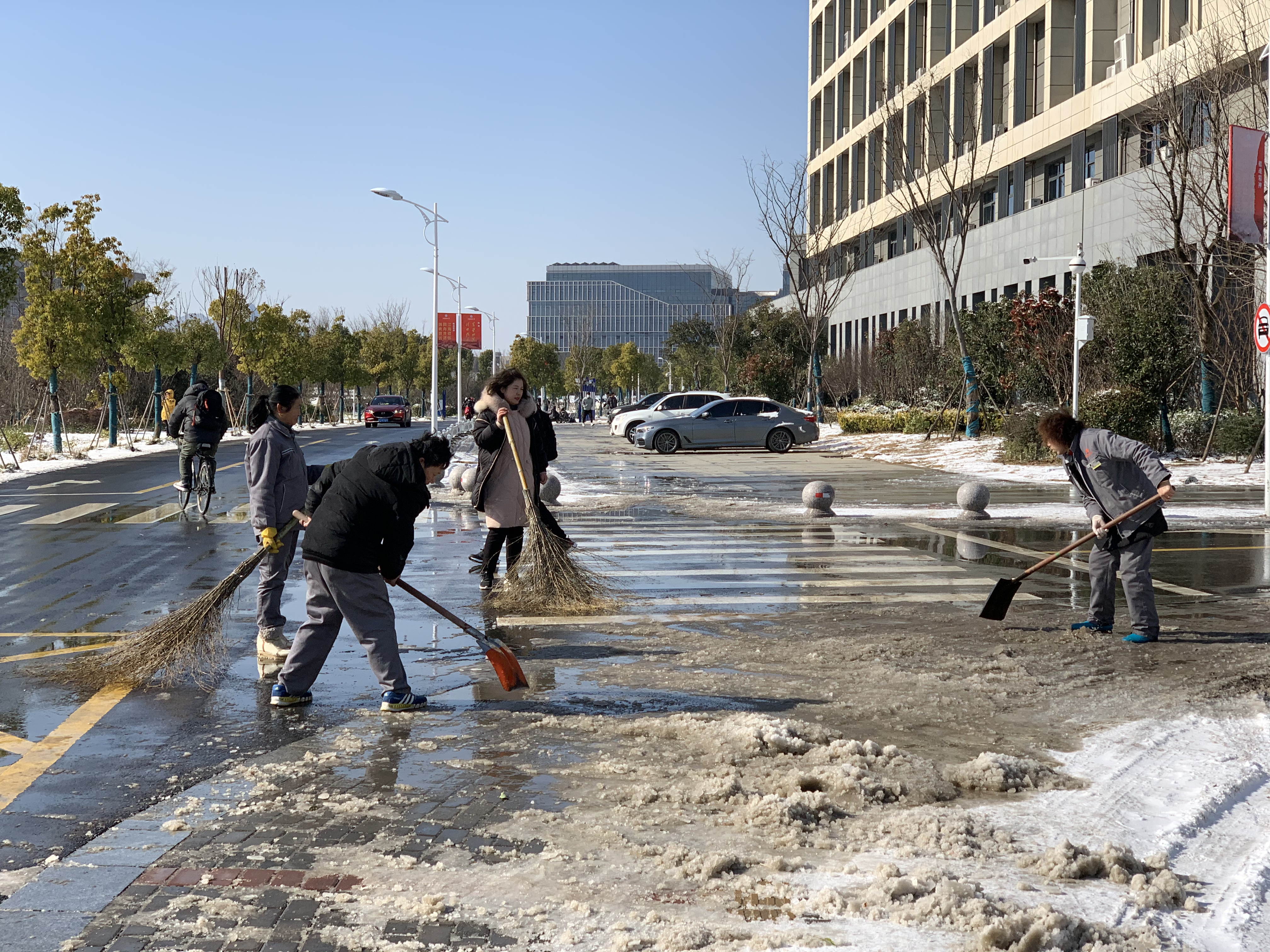 按照工作预案,30日凌晨,一组人员集中清理北大门周边道路,另一组重点清理图书馆南面的浦江路,其他人各自为战,负责打通教学楼宇、学生公寓和学生食堂门口的道路。由于天气寒冷,积雪都已结冰,增加了清理的难度。大家不畏严寒、分工协作、相互配合,有的用铁锹铲,有的用扫帚扫,有的撒融雪盐,有的铺防滑草垫,经过三个多小时奋战,几条主干道和楼宇前的通道全部打通,保证了师生出行安全。华舟物业的朱丽萍一边卖力地铲除船舶土建楼地下停车场入口处的积雪一边说:“停车场入口朝北,路面上冻后异常坚硬,撒上工业盐过了些时间,冰面在能够逐渐被铲除,但依然十分困难”。物业中心的徐才生介绍,长时间在零下的低温环境工作,“刚开始冷得直发抖,但是大家都很投入地干活,越干越热,现在身上都在冒汗,已经感觉不到寒冷。”