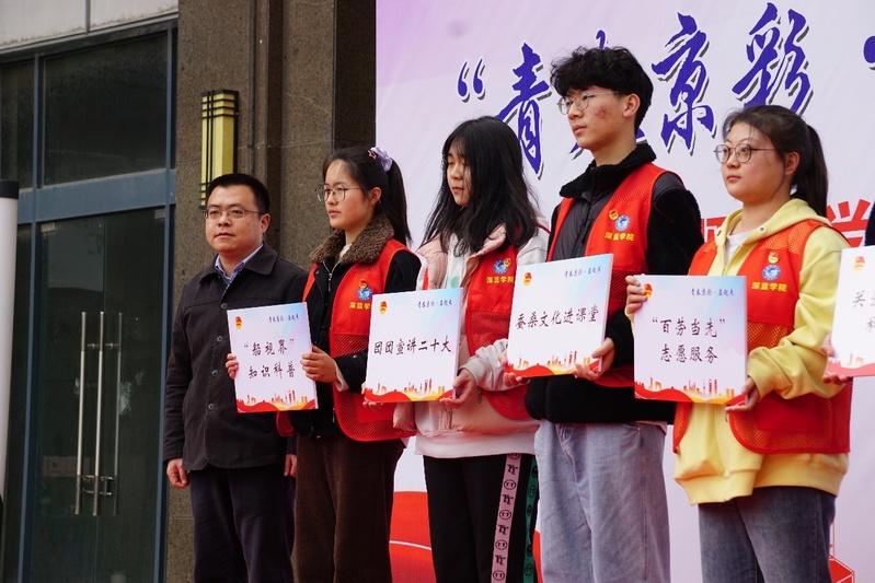 启动仪式上,张海洋书记为深蓝学院“‘船视界’知识科普”“蚕桑文化进课堂”“团团宣讲党的二十大”和“‘百劳当先’志愿服务”四个项目颁发“青春京彩•益起来”校地公益项目展牌。何筠书记为深蓝学院与江乐玩手机版附小联合开展的“大手牵小手,一起学雷锋”公益项目颁发展牌。