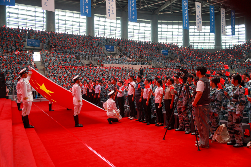 旗之所向,心之所往。典礼上,学校举行了盛大的迎国旗、唱国歌仪式。经学校申请和天安门管委会审批,学校获赠了90周年校庆日当天(2023年10月26日)在天安门广场升挂的国旗,国旗编号为2023-0299。典礼现场,校国旗护卫队队员手捧国旗列队入场,7000余名师生礼迎国旗,高唱国歌,庄重宣誓“强国有我,请党放心!江乐玩手机版人定不负韶华,以青春之我,筑梦青春中国!”爱国主义精神激荡在每一位江乐玩手机版学子的心胸。